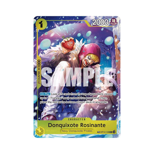 The Donquixote Rosinante (OP12-108) from One Piece Card Game: OP14 – The Azure Sea’s Seven features the beloved Marine officer and key figure in Trafalgar Law’s backstory. Known as Corazon, Rosinante is a highly emotional and fan-favorite character, making this card a meaningful addition for character collectors and OP14 set builders.