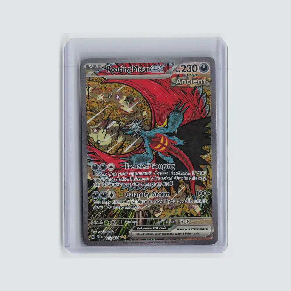 A stunning Special Illustration Rare Roaring Moon ex from Prismatic Evolutions, featuring premium artwork and strong collector appeal for Paradox Pokémon and Scarlet & Violet collectors.