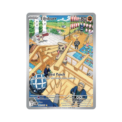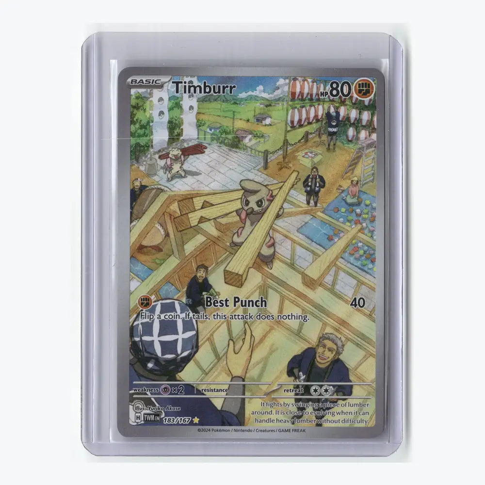 Included in SV06: Twilight Masquerade, this Timburr Illustration Rare is a collector-worthy addition from the Scarlet & Violet era. With its full-art artwork and numbering beyond the standard set range, it’s a strong choice for Illustration Rare collectors and those completing a Twilight Masquerade master set.